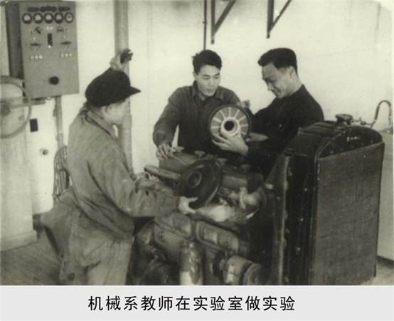 图中是分别是上个世纪五十年代电信系学生在机电工厂参加劳动、机械系教师在实验室做实验、建筑系师生在衡水地方测量铁路时的情景。